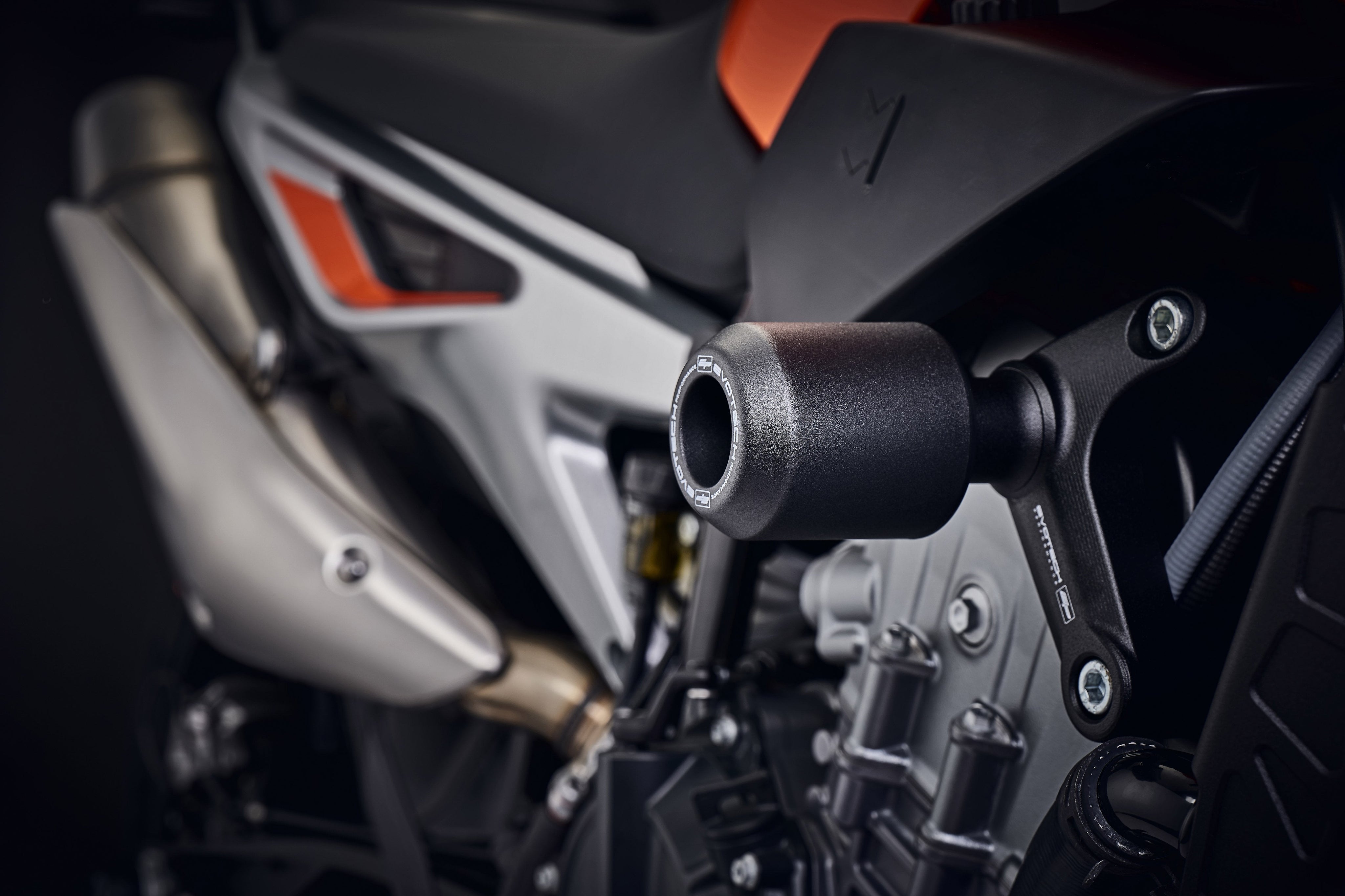 Evotech's KTM crash bobbins are incredibly easy to fit. Simply attach to your bike's existing mounting points and hit the tarmac modification free.